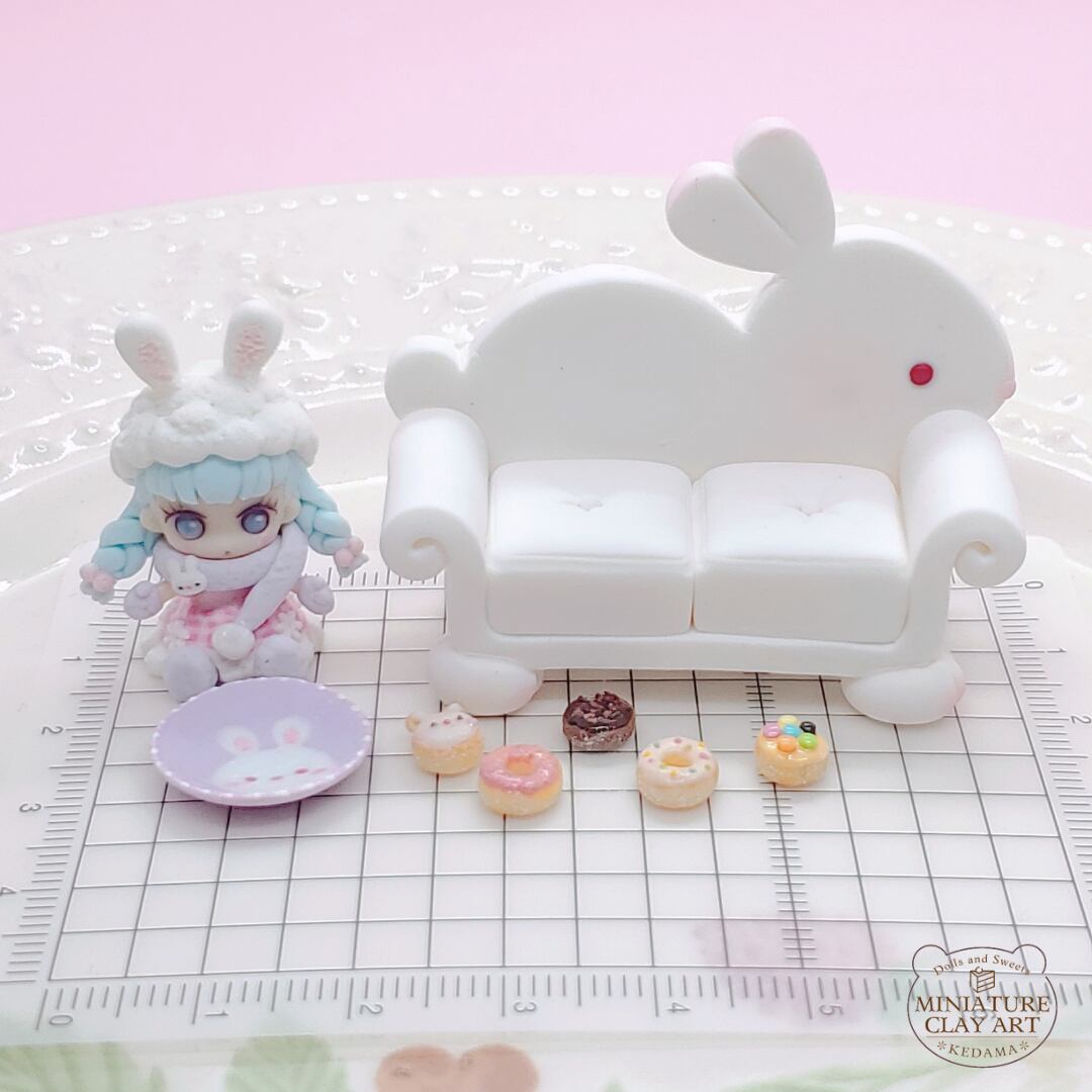 ソファの背もたれはうさぎの形のデザインになっております。うさ耳帽子をかぶったドールさんとうさぎをペイントしたプレートにはおやつのドーナツを盛り付けました✨
